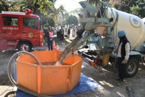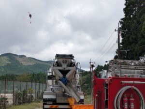 また、佐賀市関係機関、地元消防団の方々にも協力を頂き、当組合からはそれぞれの訓練でミキサー車(2台)を出動させました。